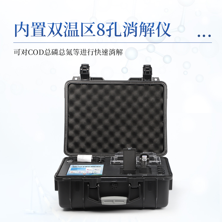 便携一体式多参数水质检测仪采用高强度PVC工程塑料手提箱设计,消解检测一体式设计,其中消解模块具备双温区功能,检测部分同时具备360°旋转比色管检测和比色皿检测,安卓智能操作系统,8英寸高清液晶触摸屏,光纤检测技术,进口光源,内置大容量锂电池,现场执法取证模块,便携多参数水质检测仪具有性能稳定、测量准确、测定范围广、功能强大、操作简单等特点。