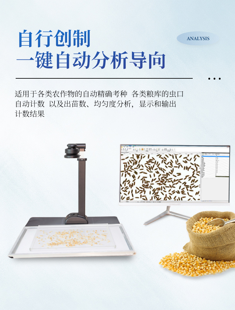 用于各类农作物实粒种子(谷粒、玉米、小麦、油菜籽等)的精确考种,各类粮库的虫口计数分析。可兼做表面光滑的昆虫计数或虫卵计数(如:米象、蚜虫、蚕卵、鱼籽等),以及被当作种子净度工作台用于种子净度检验。