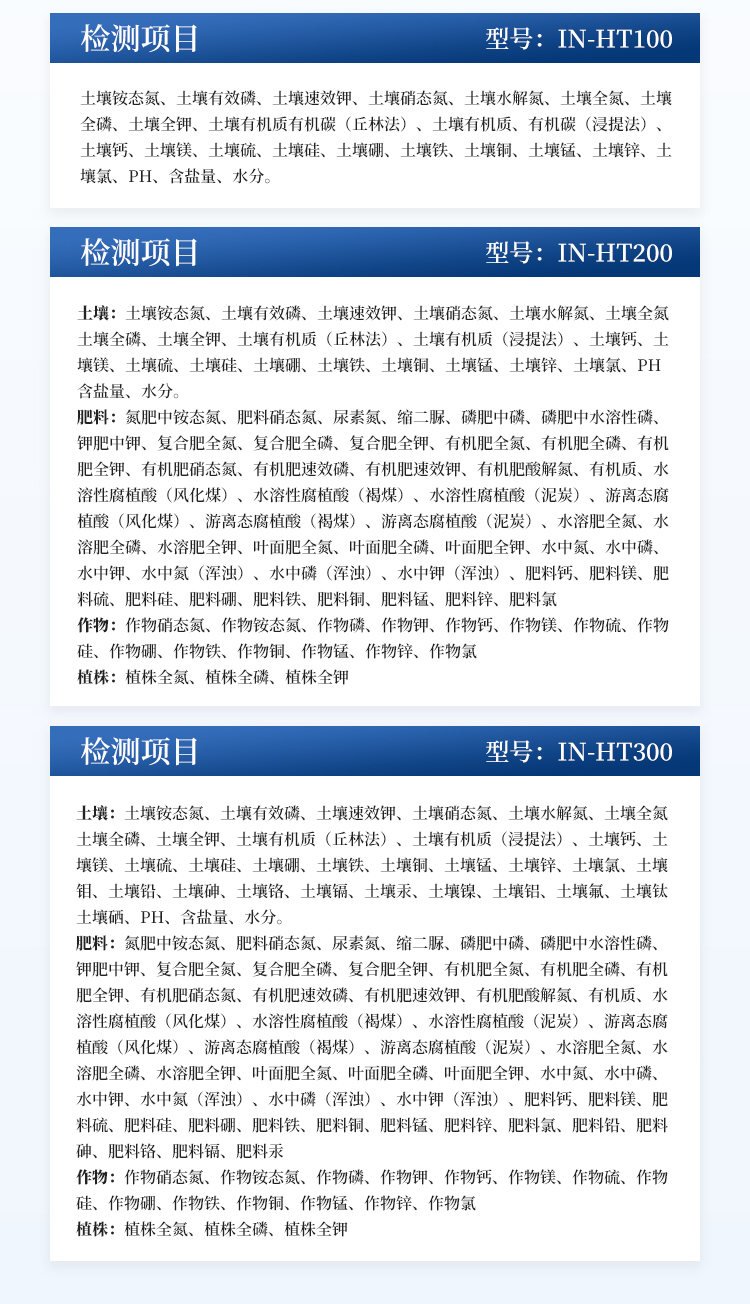 肥料:氮肥中铵态氮、肥料硝态氮、尿素氮、缩二脲、磷肥中磷、磷肥中水溶性磷、钾肥中钾、复合肥全氮、复合肥全磷、复合肥全钾、有机肥全氮、有机肥全磷、有机肥全钾、有机肥硝态氮、有机肥速效磷、有机肥速效钾、有机肥酸解氮、有机质、水溶性腐植酸(风化煤)、水溶性腐植酸(褐煤)、水溶性腐植酸(泥炭)、游离态腐植酸(风化煤)、游离态腐植酸(褐煤)、游离态腐植酸(泥炭)、水溶肥全氮、水溶肥全磷、水溶肥全钾、叶面肥全氮、叶面肥全磷、叶面肥全钾、水中氮、水中磷、水中钾、水中氮(浑浊)、水中磷(浑浊)、水中钾(浑浊)、肥料钙、肥料镁、肥料硫、肥料硅、肥料硼、肥料铁、肥料铜、肥料锰、肥料锌、肥料氯
