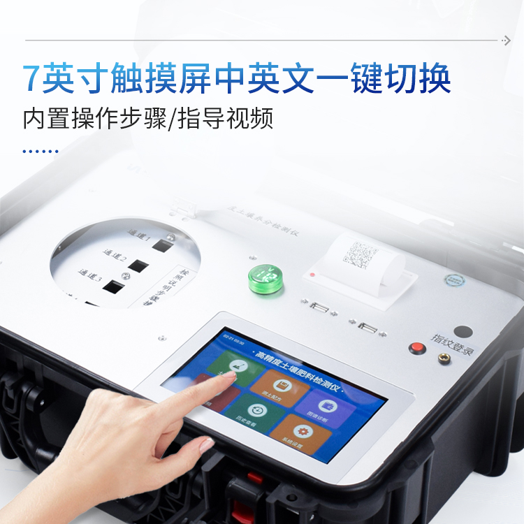 7.数据打印:内置热敏打印机(无需更换色带),可打印出检测项目、检测单位、检测人员、检测时间、通道号、吸光度、养分含量(mg/kg)、以及二维码等信息。