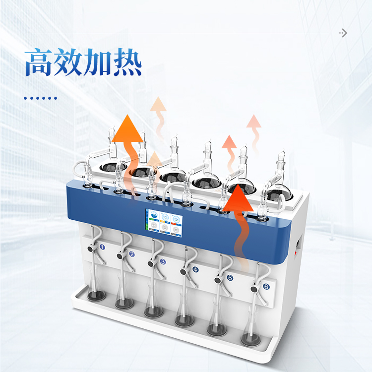 3、加热模块采用标准碗状玻纤电热套加热器,确保样品容器(圆底烧瓶)与热源密切贴合,加热功率调节范围广、加热均匀性好、热辐射效率高,蒸馏速度快、使用寿命长。