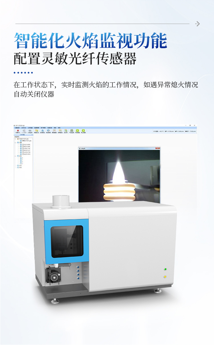 仪器配置了灵敏度高的光纤传感器,可在仪器工作状态下,实时监测火焰的工作情况,如遇异常熄火情况,可自动关闭仪器。