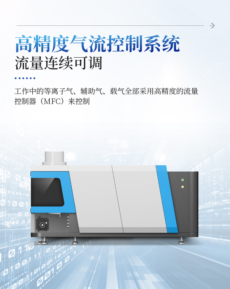 仪器工作中的等离子气、辅助气、载气、氧气全部采用高精度的质量流量控制器(MFC)来控制,具有流量连续可调、输出气流的精度高,保证了测试数据的准确性。