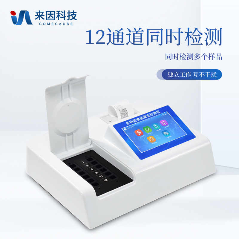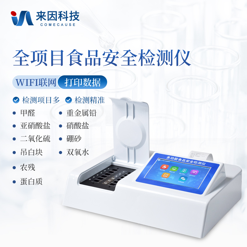 多功能食品安全检测仪可快速检测60多项目,包含非食用化学物质、滥用食品添加剂、农药残留、重金属、病害肉、营养强化剂、化学类残留、食用油脂检测、水酒饮品分析、调味品成分、食用色素等现场的定性定量检测。