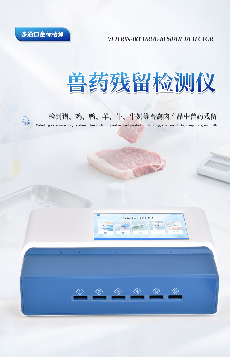 简要描述: 兽药检测仪适用于猪、鸡、鸭、羊、牛、牛奶等畜禽肉产品中兽药残留,包括抗生素类残留、瘦肉精激素类残留和水产品有毒有害物质的现场快速筛查定及定性定量检测。该多功能兽药残留检测仪为集成化肉品安全快速检测分析设备,可广泛应用于畜牧养殖场、屠宰场、食品肉产品深加工企业、食药监局、检验检疫部门、卫生部门、高教院校、科研院所、农业部门等单位使用。