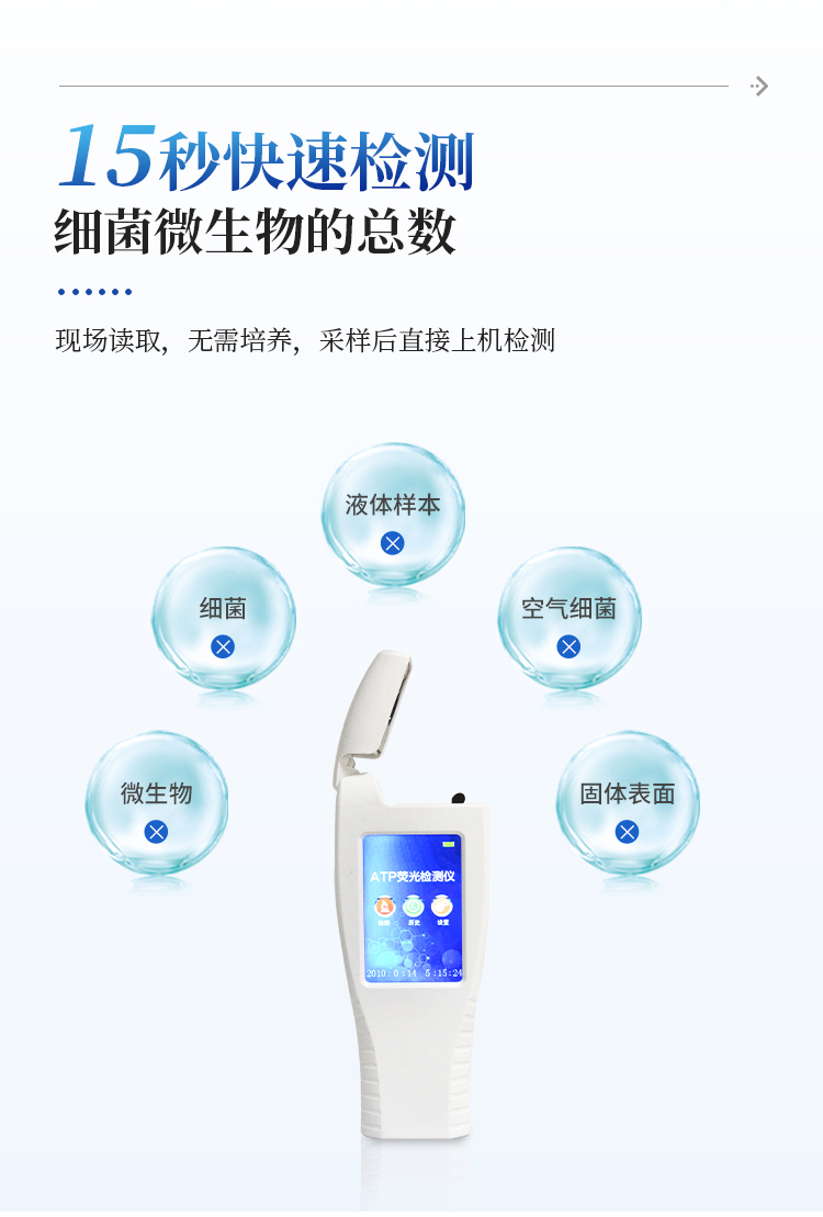 该设备为全新升级产品,安卓智能操作系统。操作采用生物化学反应方法检测ATP含量,ATP荧光检测仪基于萤火虫发光原理,利用“荧光素酶—荧光素体系”快速检测三磷酸腺苷(ATP)。ATP拭子含有可以裂解细胞膜的试剂,能将细胞内ATP释放出来,与试剂中含有的特异性酶发生反应,产生光,再用荧光照度计检测发光值,微生物的数量与发光值成正比,由于所有生物活细胞中含有恒量的ATP,所以ATP含量可以清晰地表明样品中微生物与其他生物残余的多少,用于判断卫生状况。
