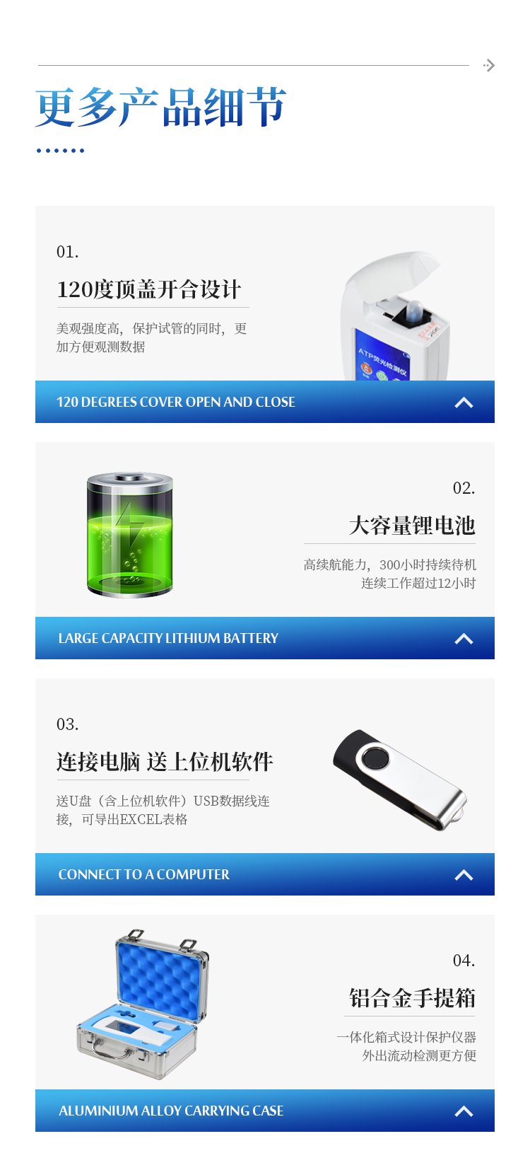 随机配置:ATP荧光检测仪(手持)主机、铝合金手提箱、驱动U盘、仪器包、挂绳、PC数据线、数据分析软件、中文操作手册。