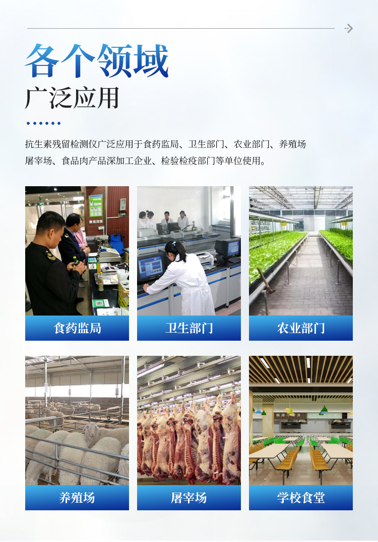 广泛应用于食药监局、卫生部门、医学院校、科研院所、农业部门、养殖场、屠宰场、食品肉产品深加工企业、检验检疫部门等单位使用。