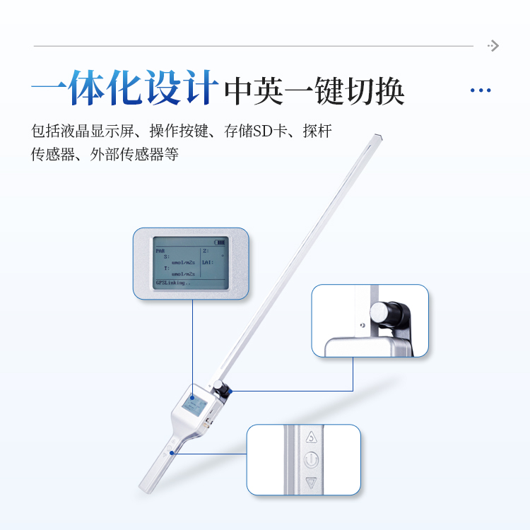 手持冠层分析仪为一体化设计,包括液晶显示屏、操作按键、存储SD卡、探杆传感器、外部传感器等。仪器菜单操作简单,体积小,携带方便。数据保存有SD卡和无线上传(选配)两种存储方式,SD卡为市场通用型卡,存储容量大,数据管理方便;无线上传联网速度快,网页可清晰查看测量的PAR值、LAI值、天顶角及GPS定位信息。功耗有合理的电源管理方案,测试过程中仪器根据实际情况自动进入待机状态,需要时按唤醒键即可唤醒屏幕,观察实际数据。测量方式分为自动和手动两种,自动测量时间间隔最小1分钟,最大60分钟,自动测量次数最大999次;手动测量根据实际需要手动采集即可。